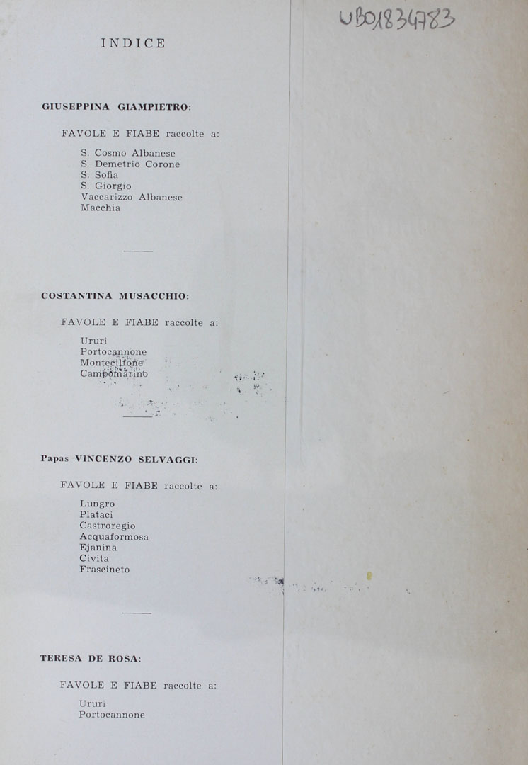 Più in particolare l’opera contiene numerosi esempi di favole e fiabe raccolte nei comuni di S. Cosmo Albanese, S. Demetrio Corone, S. Sofia, S. Giorgio, Vaccarizzo Albanese, Lungro, Plataci, Castroregio, Acquaformosa, Ejanina, Civita e Frascineto e Macchia (in provincia di Cosenza), Ururi, Portocannone, Montecilfone e Campomarino (in provincia di Campobasso).