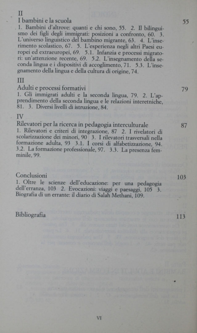 All’Introduzione seguono sei capitoli dedicati alla pedagogia interculturale e alla formazione di adulti e bambini: 1. Occasioni di cambiamento, 2. Alfabeti, strategie e compiti della pedagogia interculturale, 3. Bambini e adulti in formazione, 4. I bambini e la scuola, 5. Adulti e processi formativi, 6. Rilevatori per la ricerca in pedagogia interculturale.