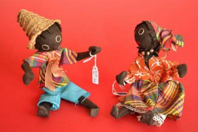- Descrizione: Bambole in filo di ferro ricoperto di panno marrone di circa 22 cm. di altezza; la femmina (1/2) indossa gonna scozzese e sottoveste bianca di cotone con pizzo e camicetta a fiori arancione e bianca; in testa porta un foulard scozzese ed è adornata con collana ed orecchini. Il maschio (2/2) indossa pantaloni alla pescatora turchesi, casacca scozzese con sciarpa arancione ed in testa porta un cappello di paglia