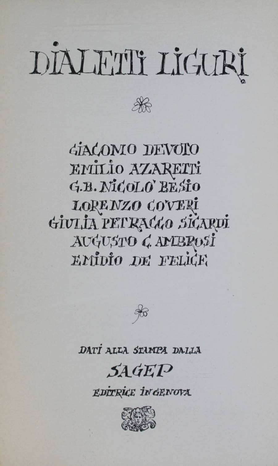 Numerosi i saggi di argomento dialettologico qui contenuti: Dialetti liguri, storia ligure di G. Devoto, I dialetti della Liguria intemelia di E. Azaretti, Il dialetto savonese di G. B. N. Besio, La Lunigiana e il dialetto di A. C. Ambrosi, Presenza del dialetto nella Genova d’oggi di L. Còveri, Definizione storica del genovese di G. Petracco Sicardi, ecc.