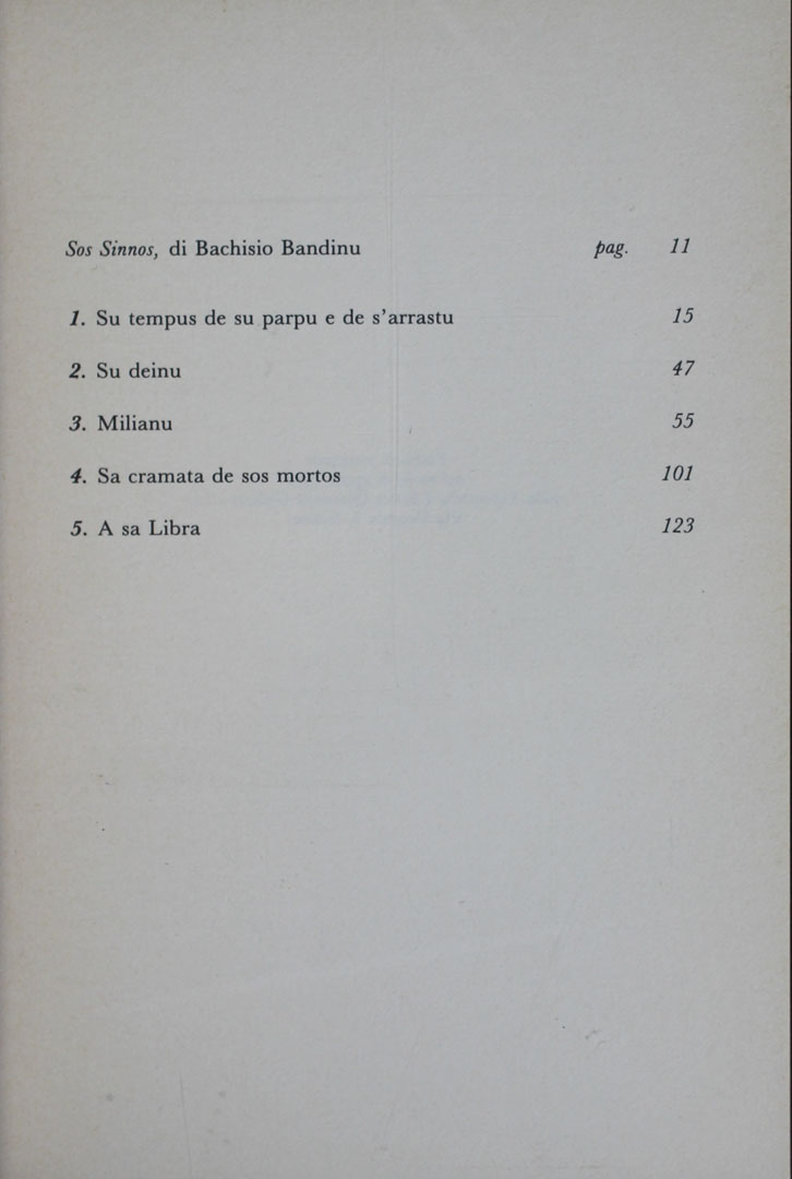 I cinque capitoli che costituiscono il romanzo (1.“Il tempo del tastare e del fiutare”, 2. “L’indovino”, 3. “Milianu”, 4. “La chiamata dei morti”, 5. “A sa libra”) sono preceduti dal saggio introduttivo di Bachisio Bandinu.