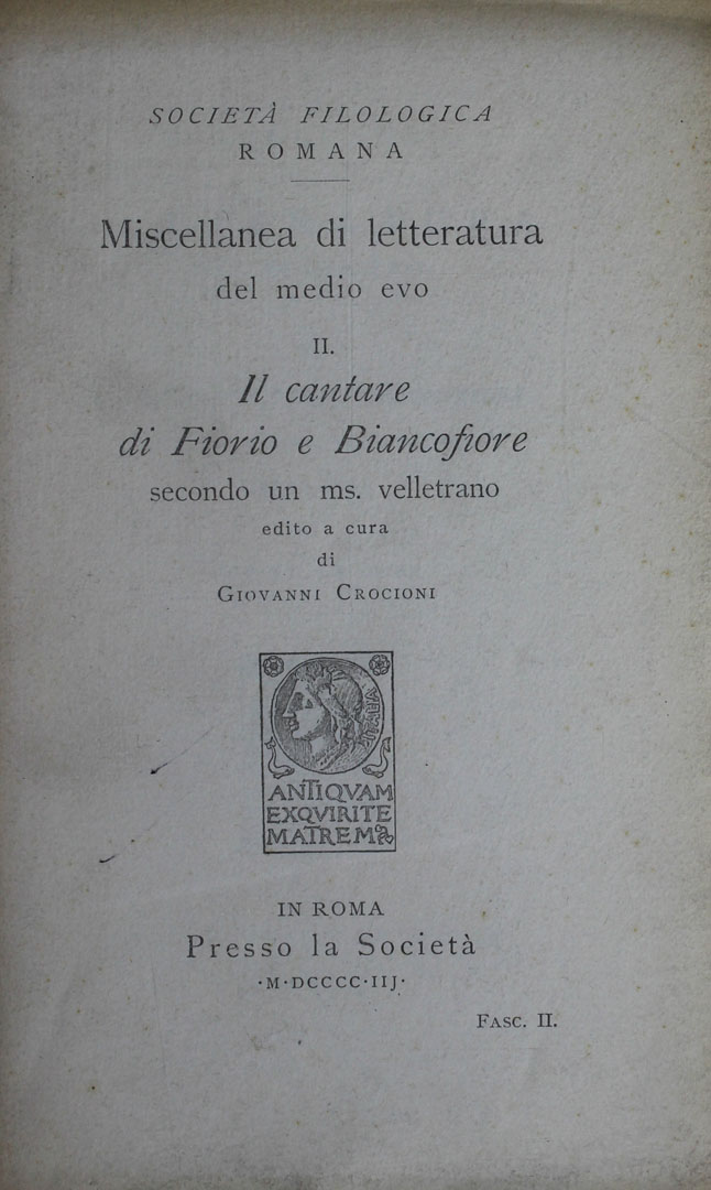 Nel presente volume, che fa parte della collana Miscellanea di letteratura del Medio Evo, Giovanni Crocioni pubblica una versione del Cantare di Fiorio e Biancofiore, leggenda medievale d'amore e d'avventura che ebbe grande diffusione in tutte le letterature europee, tramandata da un manoscritto (il codice K. IV. I) oggi conservato presso la Biblioteca comunale di Velletri.
