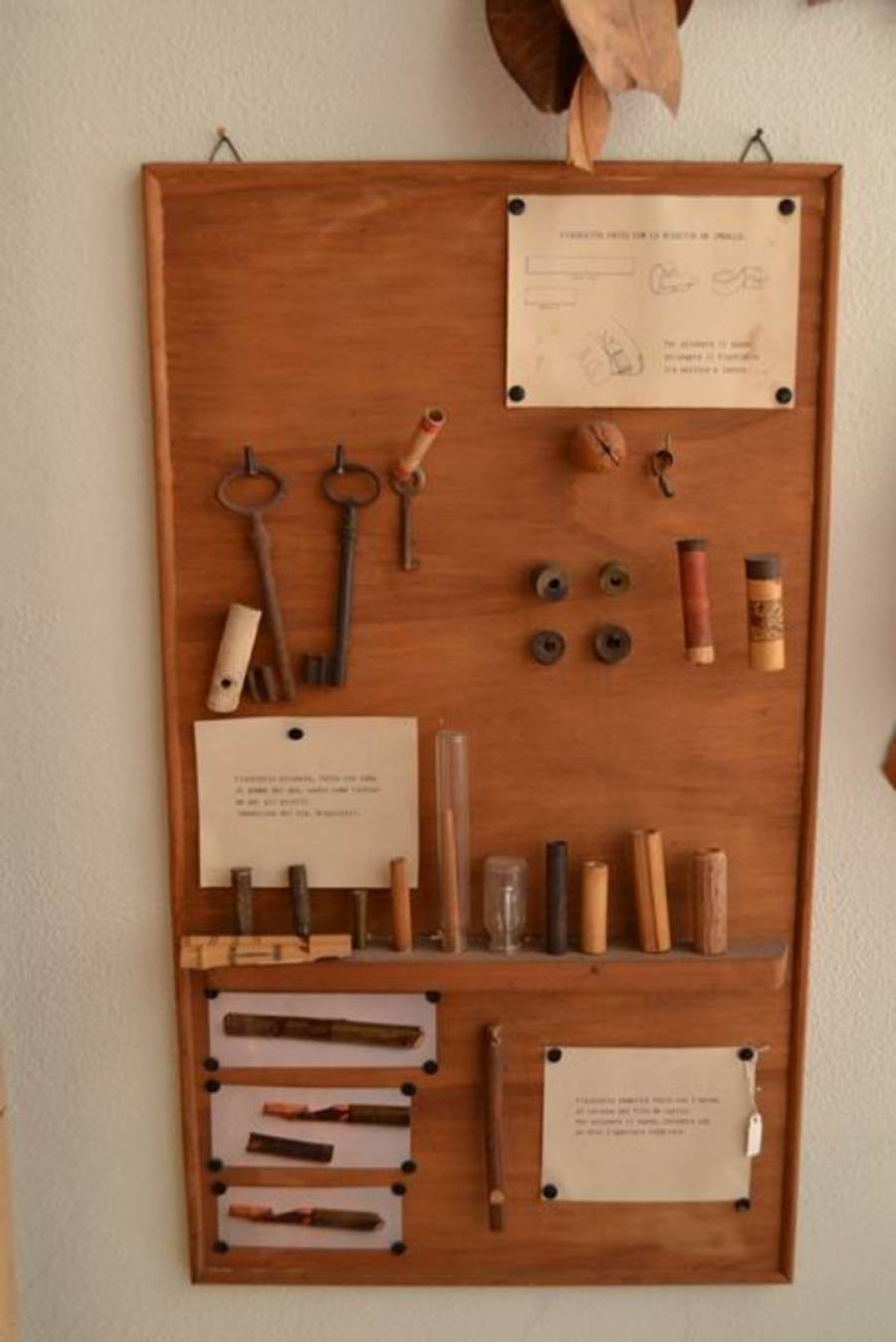 - Descrizione: Collezione di fischietti costruiti con materiali naturali e di recupero ( chiavi, spolette del filo, cartucce da caccia, legno di nocciolo, di sambuco, noce, noccioli di albicocca, piccolo contenitore di vetro, tubetto di vetro) sistemati su un pannello di legno incorniciato di 80x50 cm.