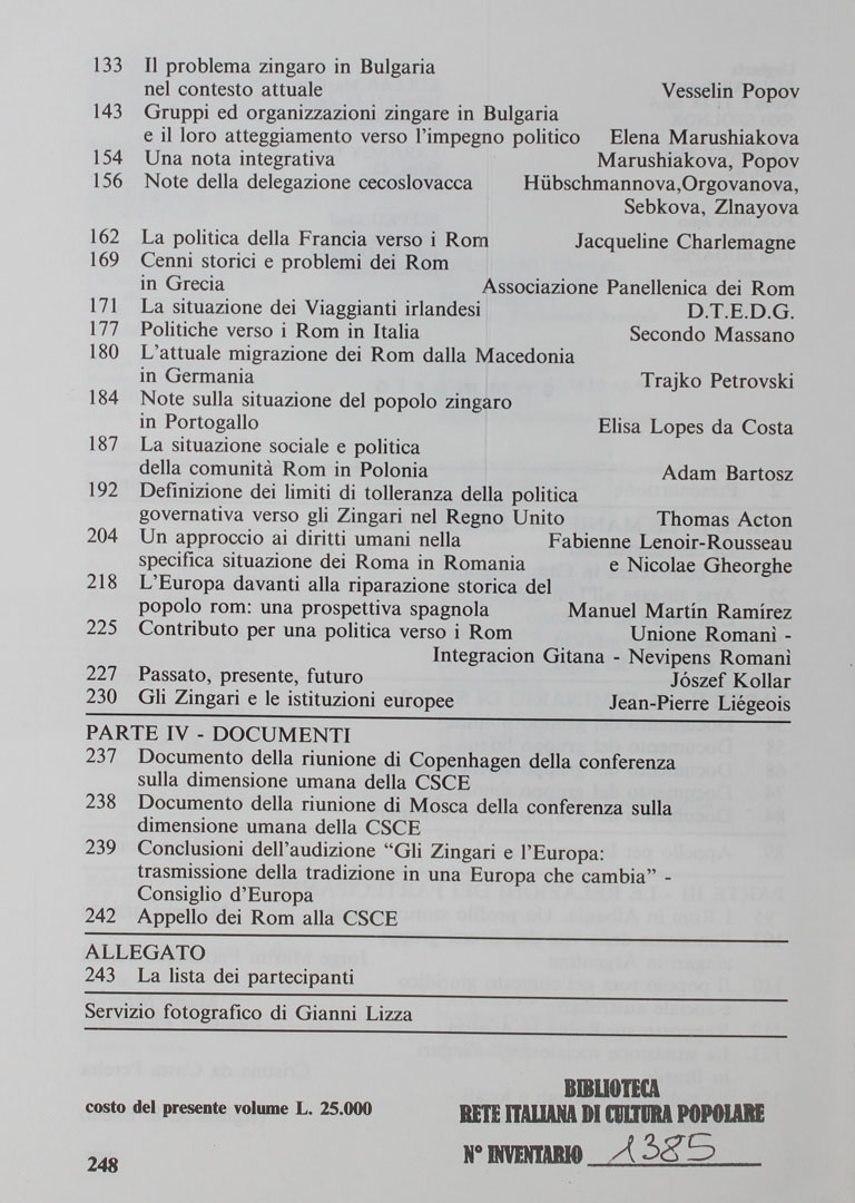 Numerosi gli interventi presentati: I Rom in Albania. Un profilo storico-sociale di M. Cortiade; Il problema zingaro in Bulgaria nel contesto attuale di V. Popov; La politica della Francia verso i Rom di J. Charlemagne; Note sulla situazione del popolo zingaro in Portogallo di E. Lopes da Costa; La situazione sociale e politica della comunità Rom in Polonia di A. Bartosz; Gli Zingari e le istituzioni europee di J.-P. Liégeois.